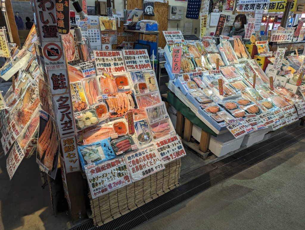 On part ce matin pour le marché d’Hakodate, pittoresque avec de nombreux étalages de poissons, poulpes, crabes et produits totalement inconnus !