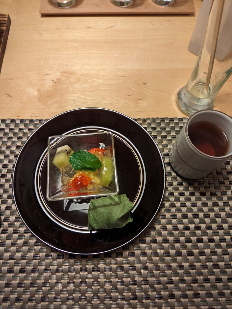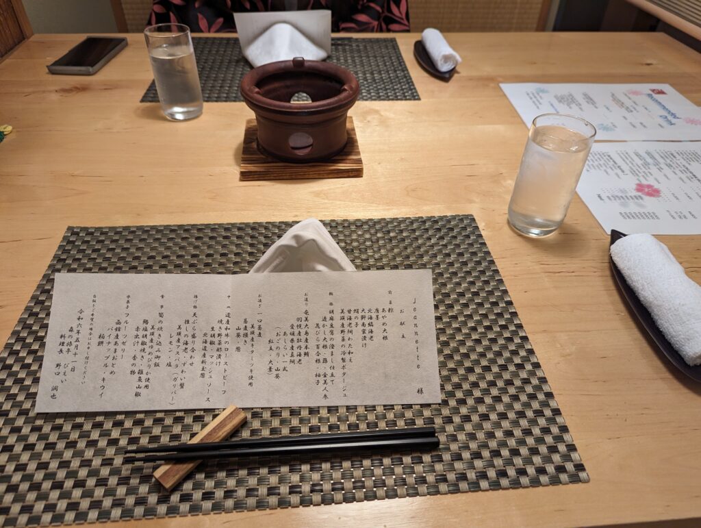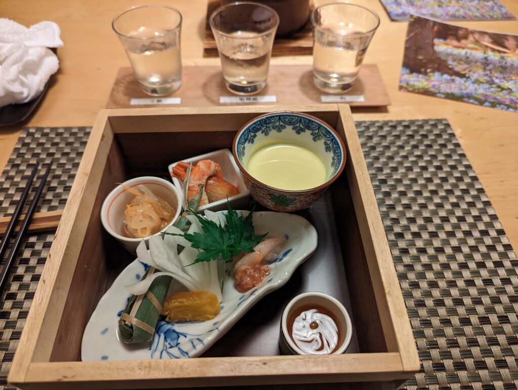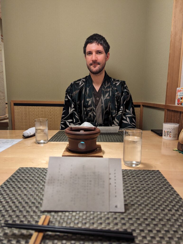 Place au repas qui nous démontrera que la gastronomie japonaise égale celle de la France (si ce n’est la surpasse d’après Poupou). Repas semi gastronomique en 7 temps en tenue de Yukata dans un espace calfeutré