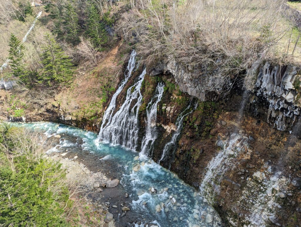 Cette petite ville abrite un lac connu pour sa couleur bleue vive. Ce lac artificiel est le fruit de la construction de barrages pour protéger les 2 villes des coulées de boue volcanique. Sa couleur bleue vient de la chute d’eau Shirahage non loin de là : l’eau ruisselle contre la falaise et charrie l’aluminium présent dans les parois. Mais ce n’est pas tout, d’autres substances, comme le sulfure, parviennent jusqu’au fond de l’étang, blanchissant ainsi les pierres.