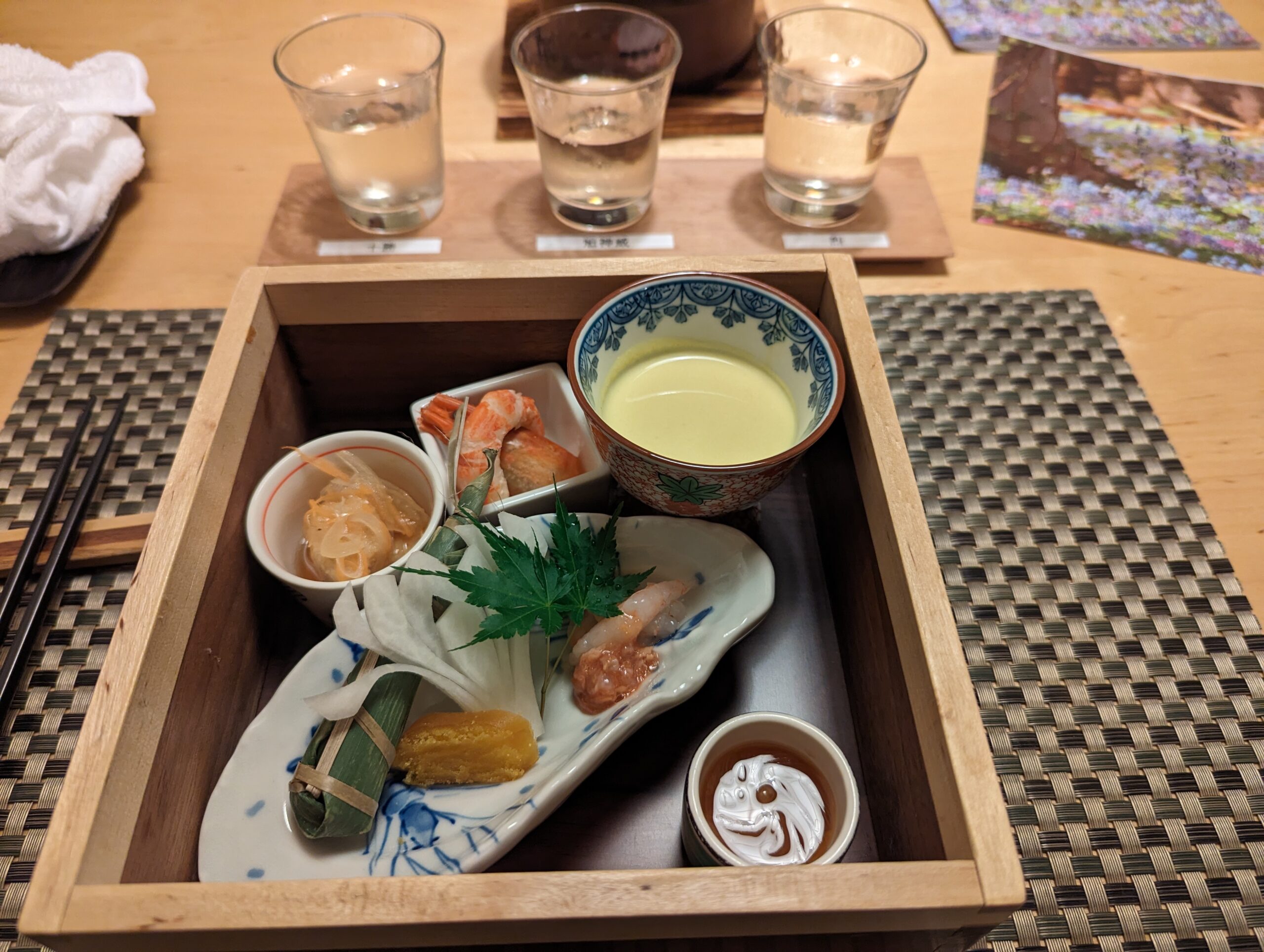 Place au repas qui nous démontrera que la gastronomie japonaise égale celle de la France (si ce n’est la surpasse d’après Poupou). Repas semi gastronomique en 7 temps en tenue de Yukata dans un espace calfeutré