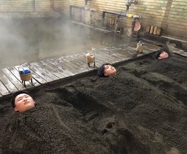 L’après midi, on se fait enterrer sous du sable chaud en yakuta, expérience paisible d’être enveloppé sous le poids d’un sable chaud, puis on fait un onsen, température brûlante, effet écrevisse immédiat!