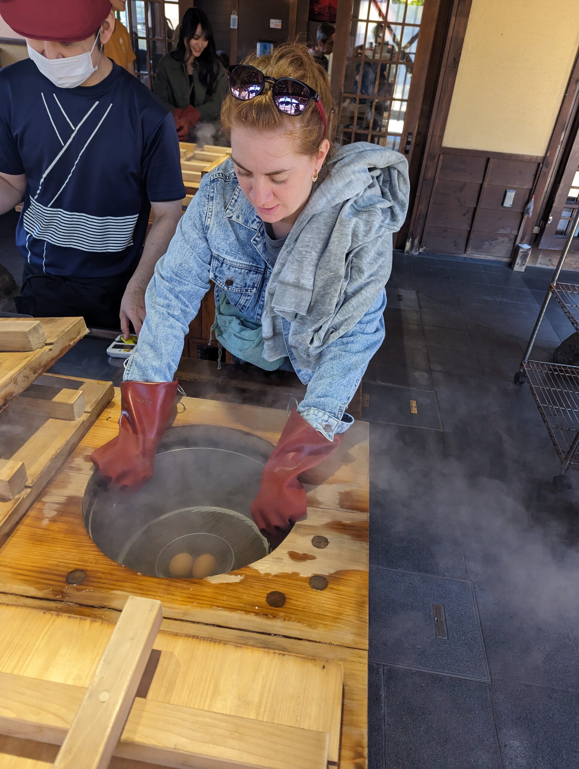 L’après midi, on se fait enterrer sous du sable chaud en yakuta, expérience paisible d’être enveloppé sous le poids d’un sable chaud, puis on fait un onsen, température brûlante, effet écrevisse immédiat!