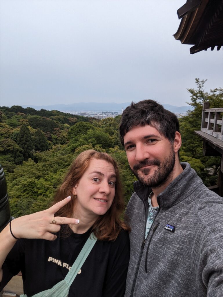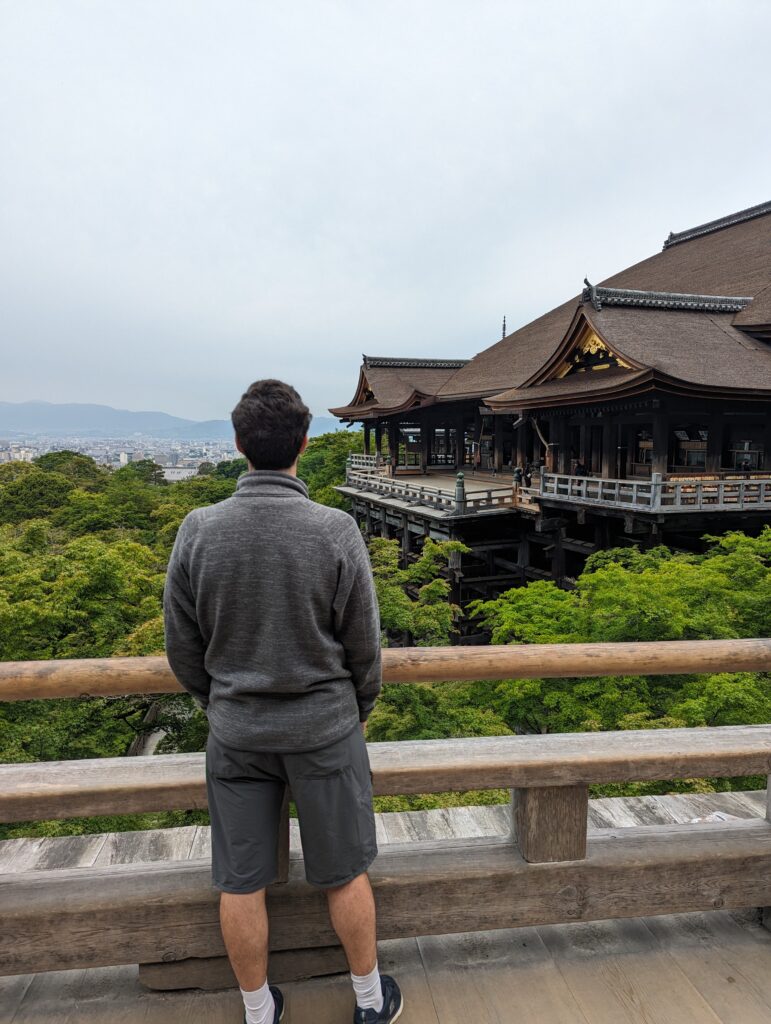 Kyoto, littéralement « ville capitale » est l’ancienne capitale du Japon, aujourd’hui son centre culturel et traditionnel. Ville pas très grande, elle est réputée pour être bondée de touristes, surtout depuis quelques années avec la faible valeur du Yen. Des mesures recentes sont même prises par la ville pour commencer à interdir des zones aux touristes dont une minorité non respectueuse bafoue traditions et respect. Afin de profiter de Kyoto sans sa foule on décide donc de se lever à 5H pour arriver à l’ouverture à 6h du Kiyomizu-dera (date de 778), un des temple les plus connus de la ville, qui offre une belle vue. Le temple tient son nom de la chute d’eau qui se trouve à l’intérieur de son enceinte. L’expression japonaise « se jeter du Kiyomizu-dera » est l’équivalent de l’expression française « se jeter à l’eau ».