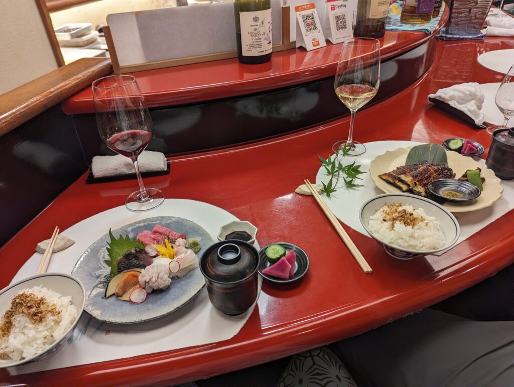 On prend donc un bus pour rentrer nous reposer à l’appartement un moment. Finalement nous ressortons pour aller dans le quartier de Gion (rues traditionnnelles avec maisons en bois, où s’il l’on a de la chance, on peut apercevoir une geisha, et on pense en avoir vu une). On mange dans un resto un peu chic mais abordable et nous pouvons enfin déguster notre premier verre de vin japonais. Un Muscat bailey A pour Jeajea et un Koshu pour Poupou. Celui-ci a particulièrement apprécié son anguille grillée.