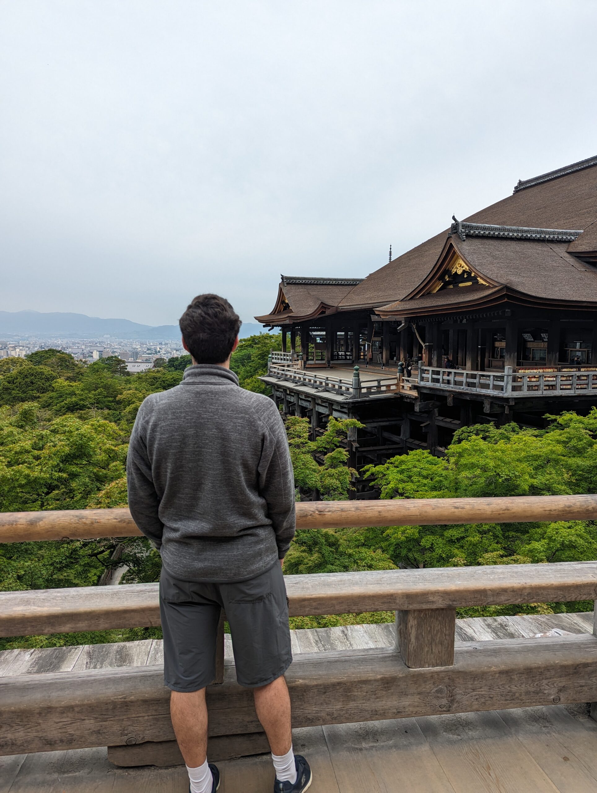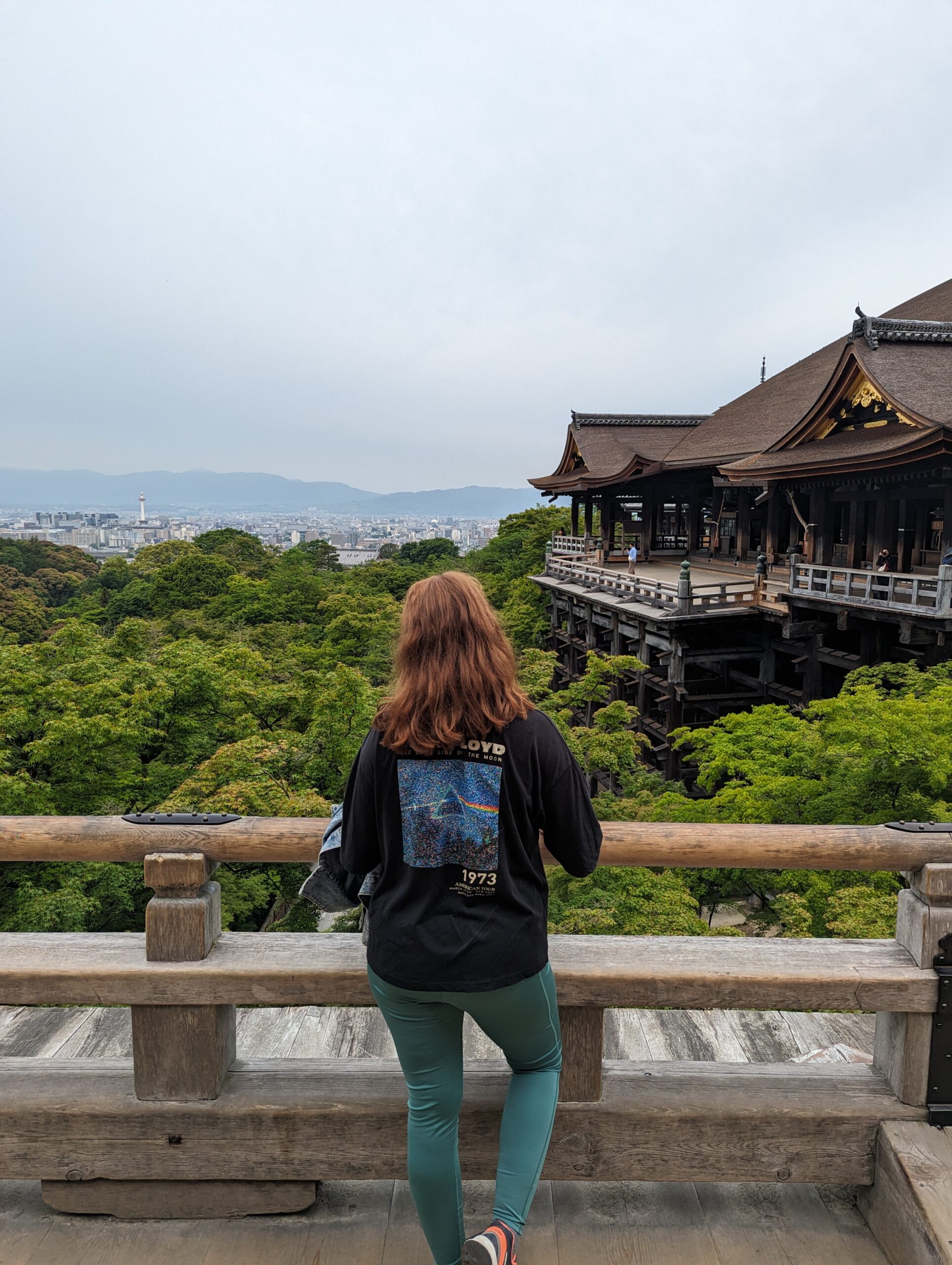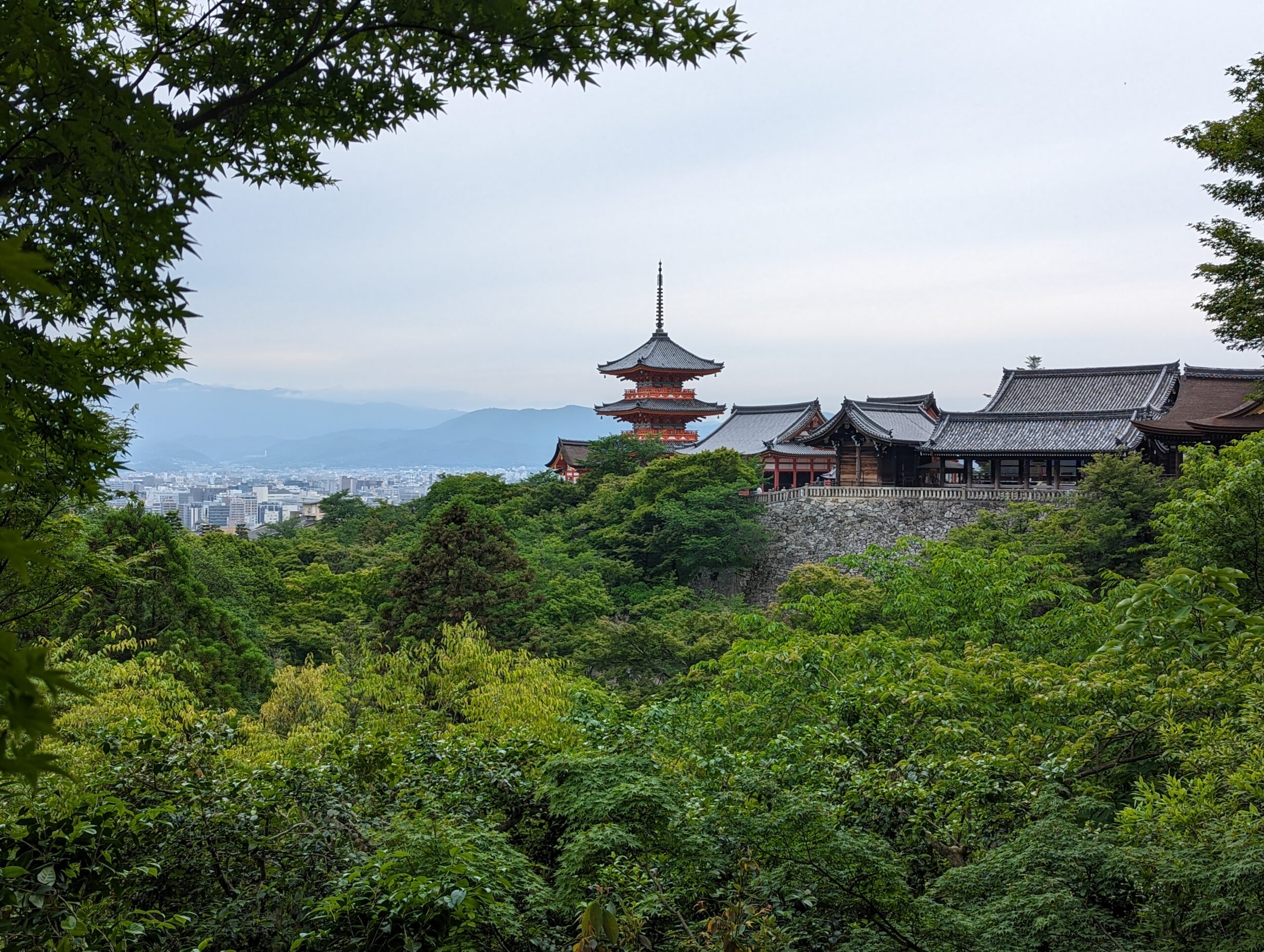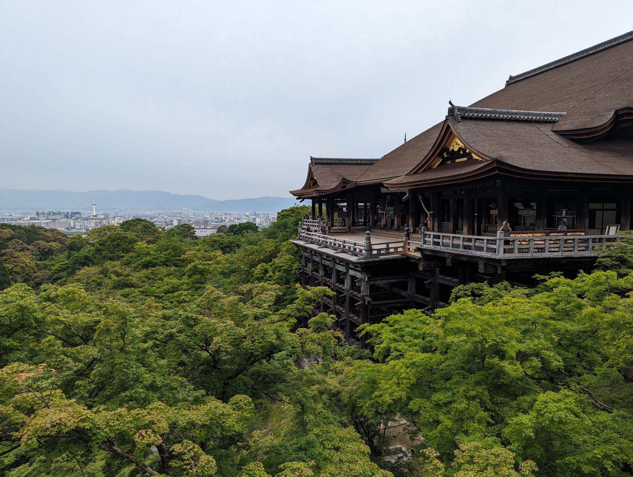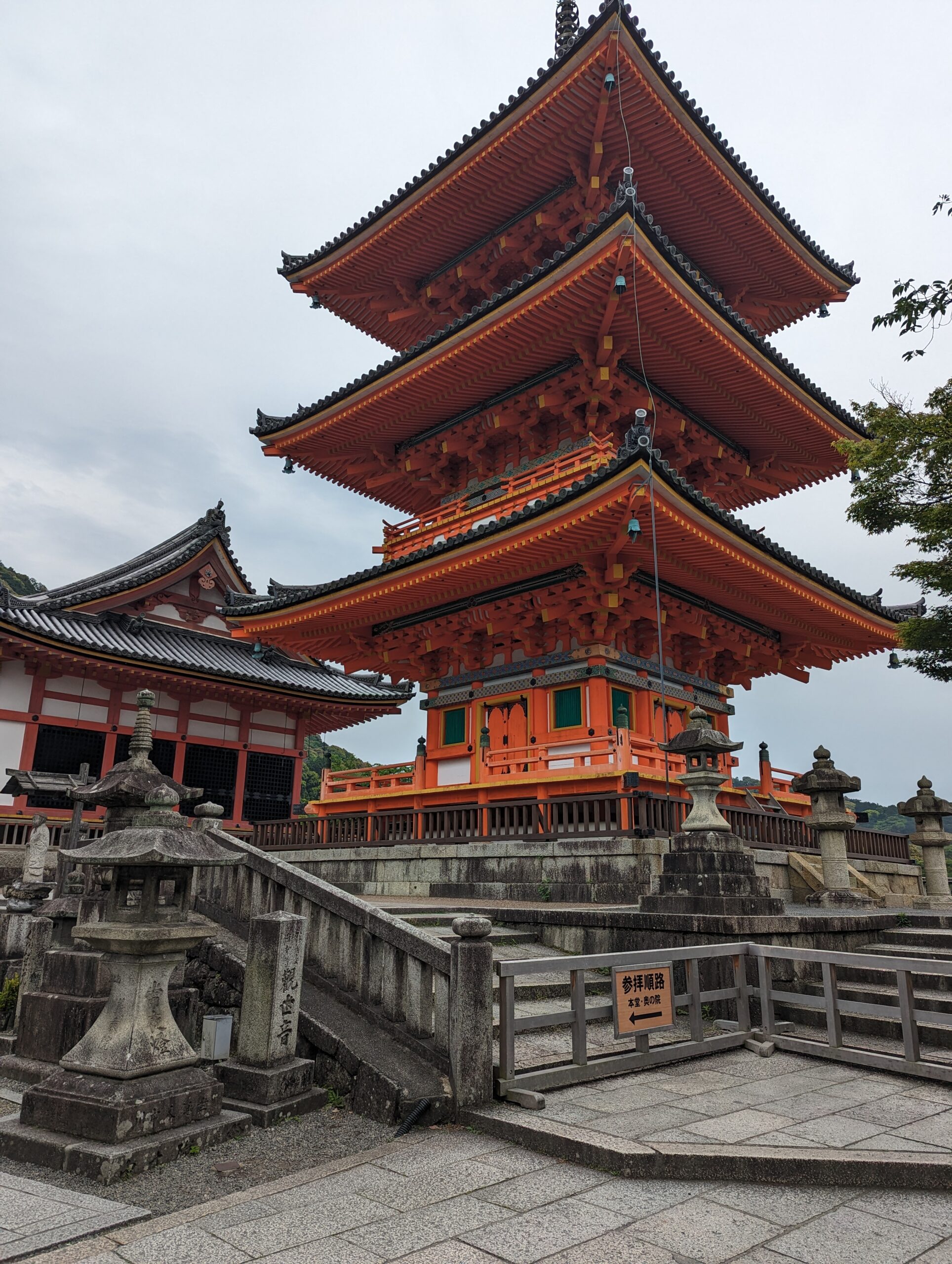 Kyoto, littéralement « ville capitale » est l’ancienne capitale du Japon, aujourd’hui son centre culturel et traditionnel. Ville pas très grande, elle est réputée pour être bondée de touristes, surtout depuis quelques années avec la faible valeur du Yen. Des mesures recentes sont même prises par la ville pour commencer à interdir des zones aux touristes dont une minorité non respectueuse bafoue traditions et respect. Afin de profiter de Kyoto sans sa foule on décide donc de se lever à 5H pour arriver à l’ouverture à 6h du Kiyomizu-dera (date de 778), un des temple les plus connus de la ville, qui offre une belle vue. Le temple tient son nom de la chute d’eau qui se trouve à l’intérieur de son enceinte. L’expression japonaise « se jeter du Kiyomizu-dera » est l’équivalent de l’expression française « se jeter à l’eau ».