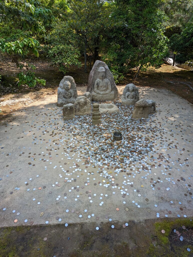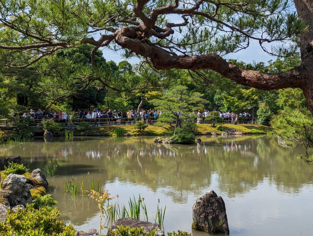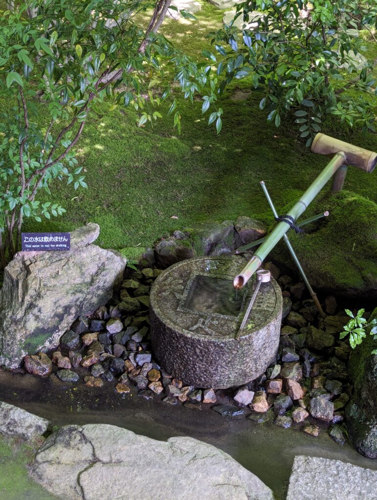 Ensuite on se dirige vers Ryōan-ji (1458) un temple bouddhiste zen, comme celui de hier mais en moins bien… Un grand jardin dont on fait le tour et le temple qui contient des murs peints, un jardin zen et une bassine en pierre Tsukubai. Elle était utilisée pour la cérémonie du thé. Son inscription pourrait être traduite (par nous en tout cas) comme « j’apprends à être satisfait ».
