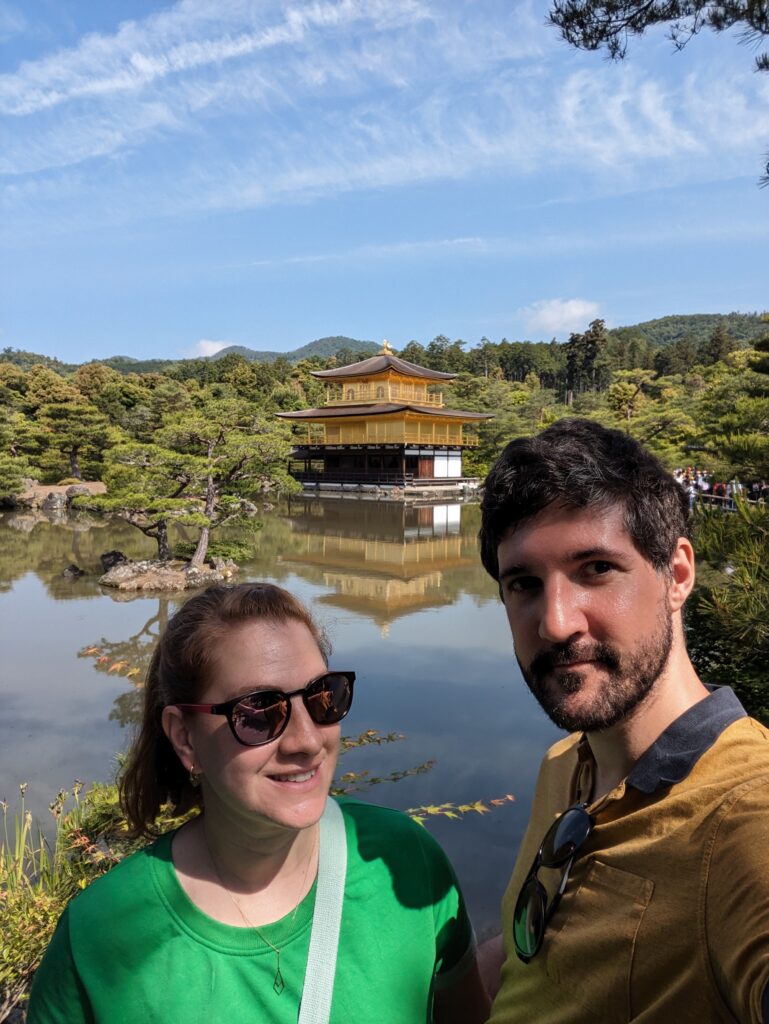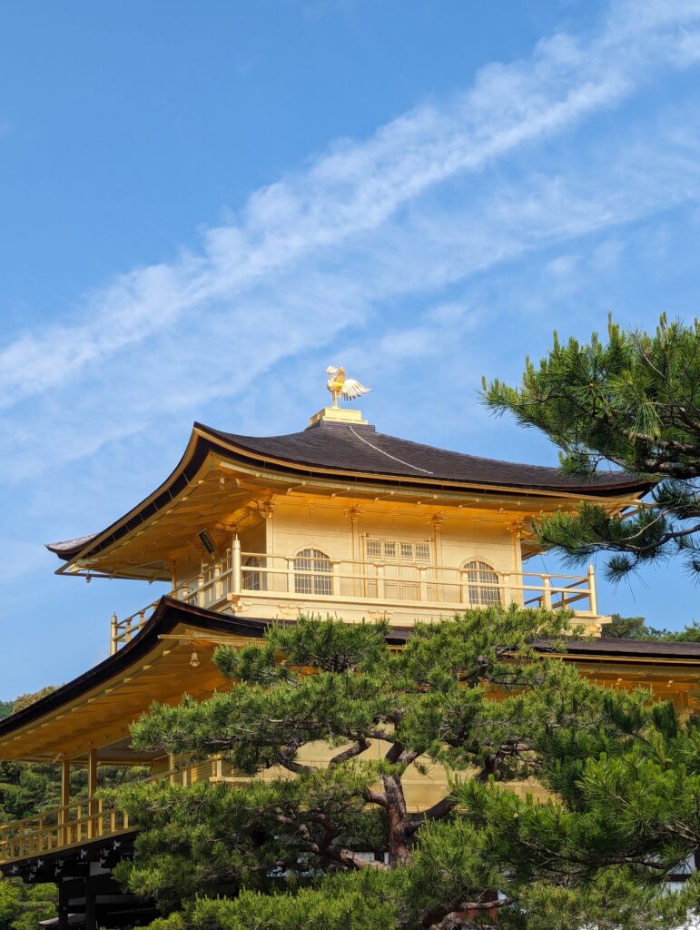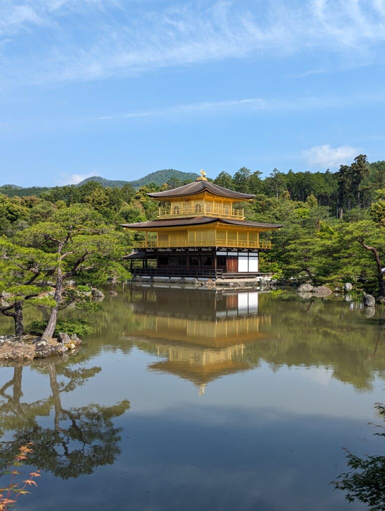 Aujourd’hui pas de réveil trop tôt, mais faut dire que le premier lieu sur notre liste n’ouvre qu’à 9h. Vu les distances, on se déplacera en bus principalement. C’est donc par le Kinkaku-Ji ou « Golden pavillon » que nous commençons notre journée de visite. Lieu hautement touristique. Yoshimitsu l’a fait construire en 1397 et y a vécu. Il est le troisième des Shoguns Ashikaga. Selon ses volontés, à sa mort, son fils Yoshimochi en fait un temple zen de l’école Rinzai. Le temple a été incendié plusieurs fois pendant les guerres d’Ōnin (1467-1477) et seul le Pavillon d’or avait survécu. Finalement un moine instable y a mis le feu en 1950 et la reconstruction date de 1955. L’authenticité de ses matériaux ne le qualifiant plus comme patrimoine national exceptionnel, il a été retiré de la liste des trésors nationaux. Cependant, le parc du temple, classé depuis 1925, est reclassé en 1956 site historique spécial du Japon et lieu spécial de beauté pittoresque. Cela reste un très beau pavillon doré.