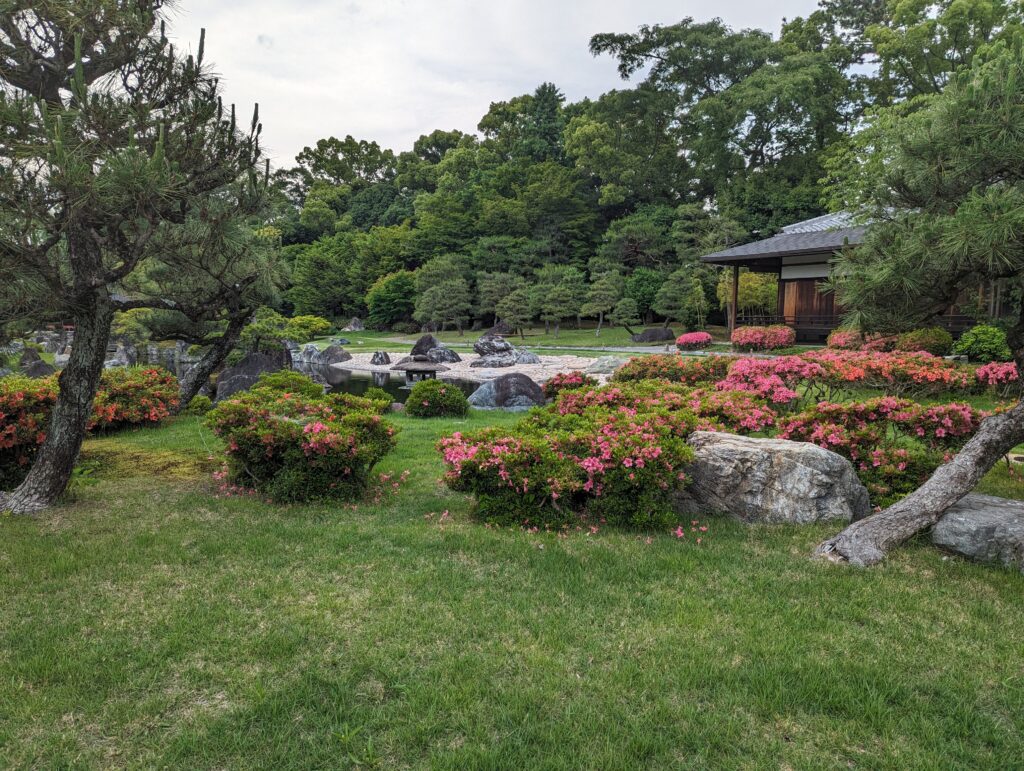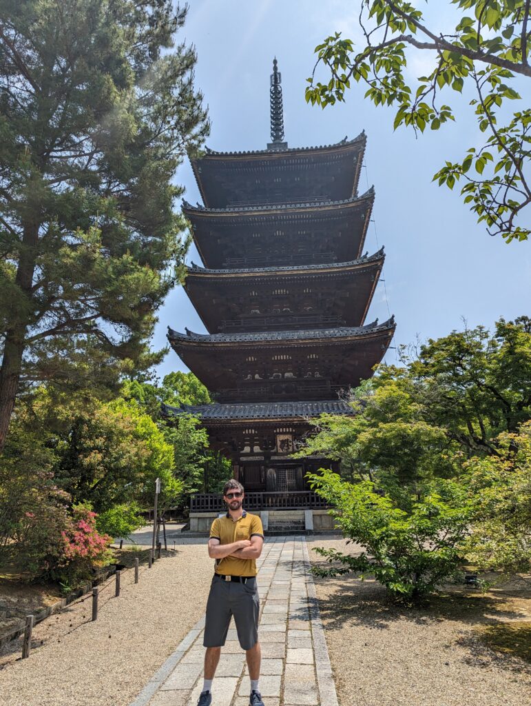 Ensuite on va voir Ninna-ji, temple bouddhiste japonais de la secte shingon, fondé en 888 par l’empereur Uda et faisant partie des monuments historiques de l’ancienne Kyōto inscrits au patrimoine mondial de l’UNESCO depuis 1994. Il a été détruit pendant la guerre d’Ōnin, et il fut reconstruit au 17e siècle. Il est constitué de plusieurs bâtiments dont un pavillon de thé et une pagode de cinq étages construits dans un vaste jardin avec lac artificiel et plantation de cerisiers nains.