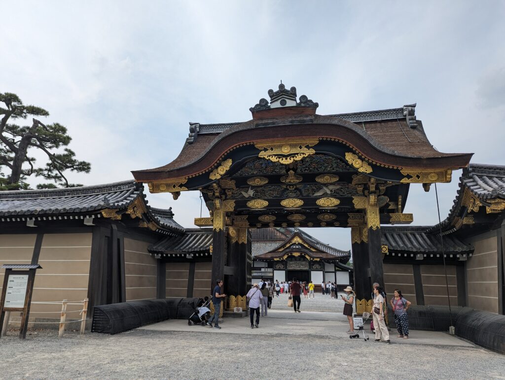 En ressortant on se dépêche d’aller visiter le château Nino-jo, ancienne villa impériale. Il a été achevé en 1603 sur ordre de Tokugawa Ieyasu, le célèbre fondateur et premier Shogun du shogunat Tokugawa. C’est lui qui a unifié le pays après une période de guerre civile. Le château servait de résidence à Kyoto au shogun lors de ses visites à la capitale impériale. Il a été fortement restauré en 2011. L’intérieur du palais était beau, avec ses peintures murales sur bois. Mais interdiction de faire des photos.