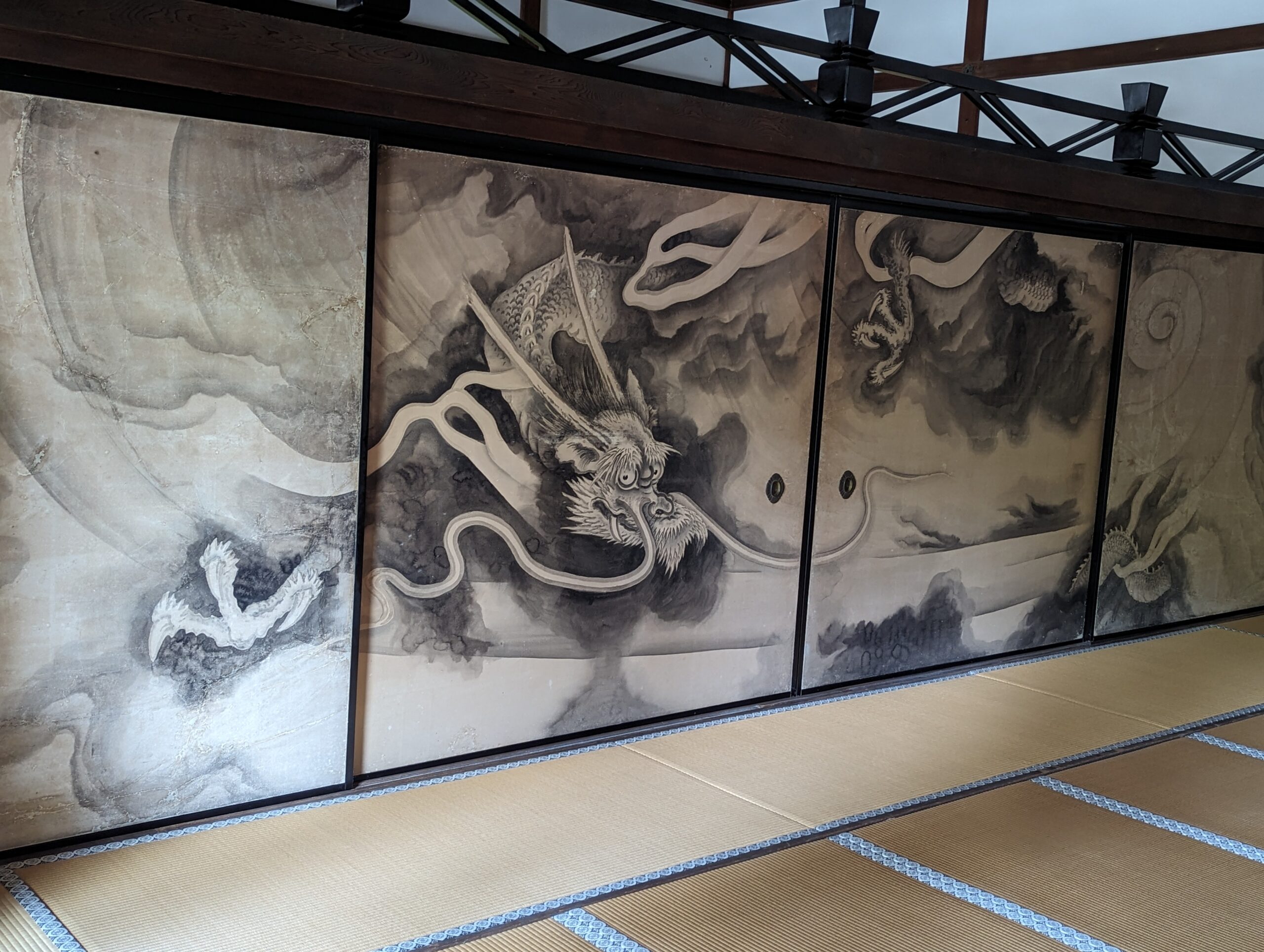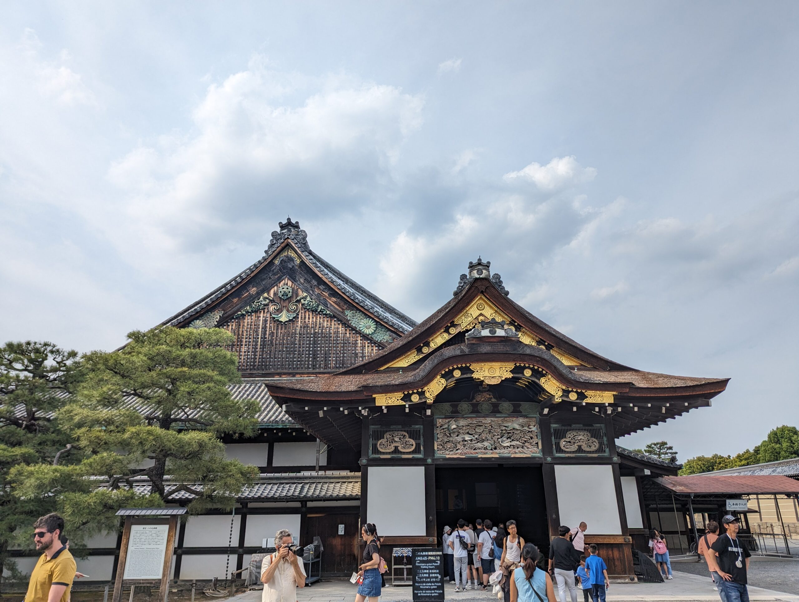 En ressortant on se dépêche d’aller visiter le château Nino-jo, ancienne villa impériale. Il a été achevé en 1603 sur ordre de Tokugawa Ieyasu, le célèbre fondateur et premier Shogun du shogunat Tokugawa. C’est lui qui a unifié le pays après une période de guerre civile. Le château servait de résidence à Kyoto au shogun lors de ses visites à la capitale impériale. Il a été fortement restauré en 2011. L’intérieur du palais était beau, avec ses peintures murales sur bois. Mais interdiction de faire des photos.