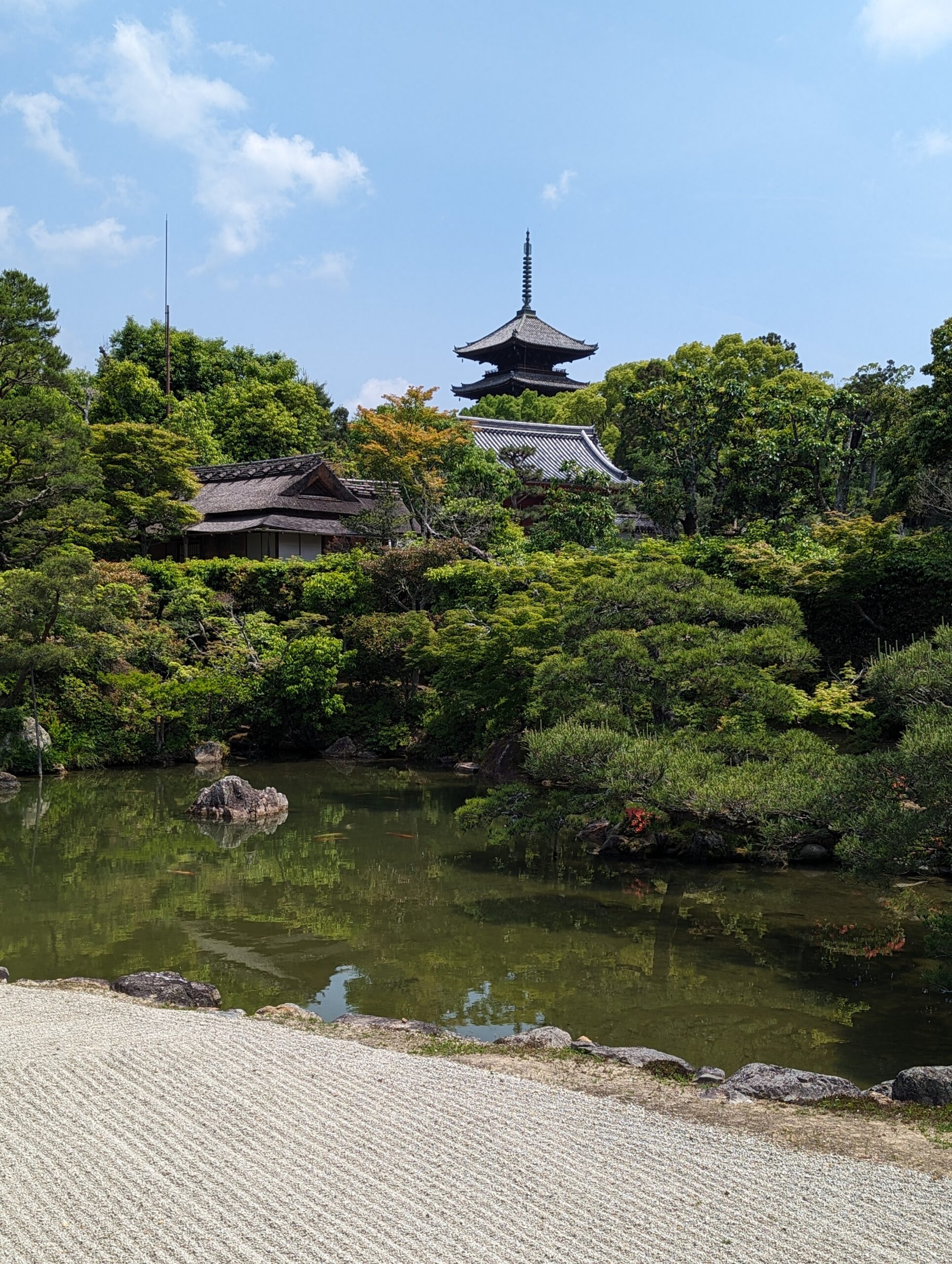 Ensuite on va voir Ninna-ji, temple bouddhiste japonais de la secte shingon, fondé en 888 par l’empereur Uda et faisant partie des monuments historiques de l’ancienne Kyōto inscrits au patrimoine mondial de l’UNESCO depuis 1994. Il a été détruit pendant la guerre d’Ōnin, et il fut reconstruit au 17e siècle. Il est constitué de plusieurs bâtiments dont un pavillon de thé et une pagode de cinq étages construits dans un vaste jardin avec lac artificiel et plantation de cerisiers nains.