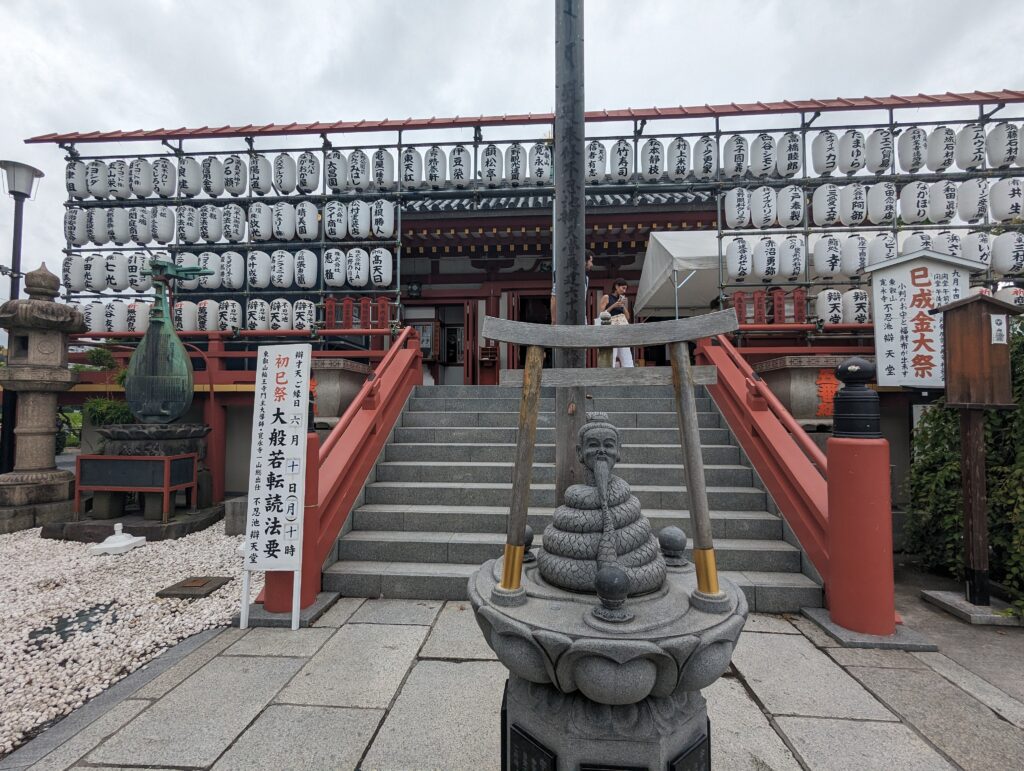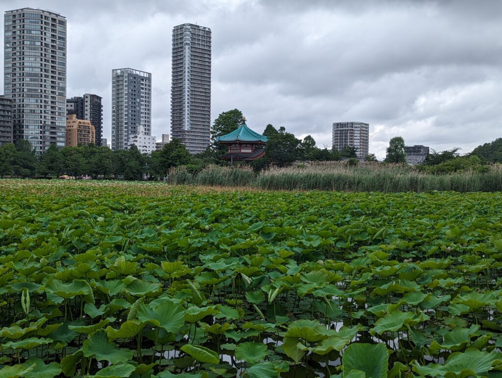 Et l’on va voir un petit parc. Ce dernier abrite un petit temple au milieu d’un étang couvert de nénuphars. Le contraste avec les buildings derrière est assez caractéristique des grandes villes japonaises. On complète notre collection de Goshuin (pour rappel ce sont des tampons sacrés et calligraphiés délivrés dans les temples)