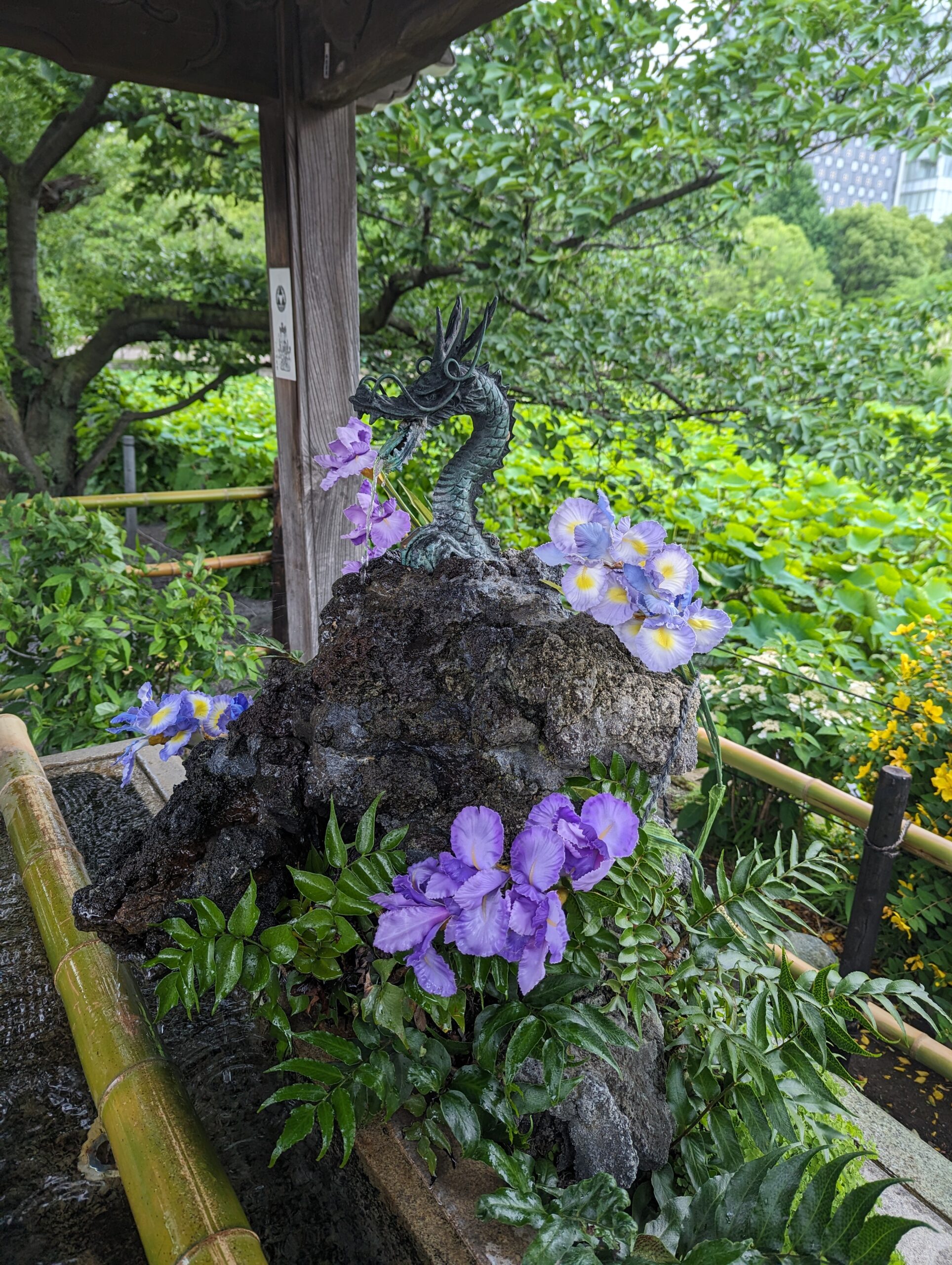 Et l’on va voir un petit parc. Ce dernier abrite un petit temple au milieu d’un étang couvert de nénuphars. Le contraste avec les buildings derrière est assez caractéristique des grandes villes japonaises. On complète notre collection de Goshuin (pour rappel ce sont des tampons sacrés et calligraphiés délivrés dans les temples)