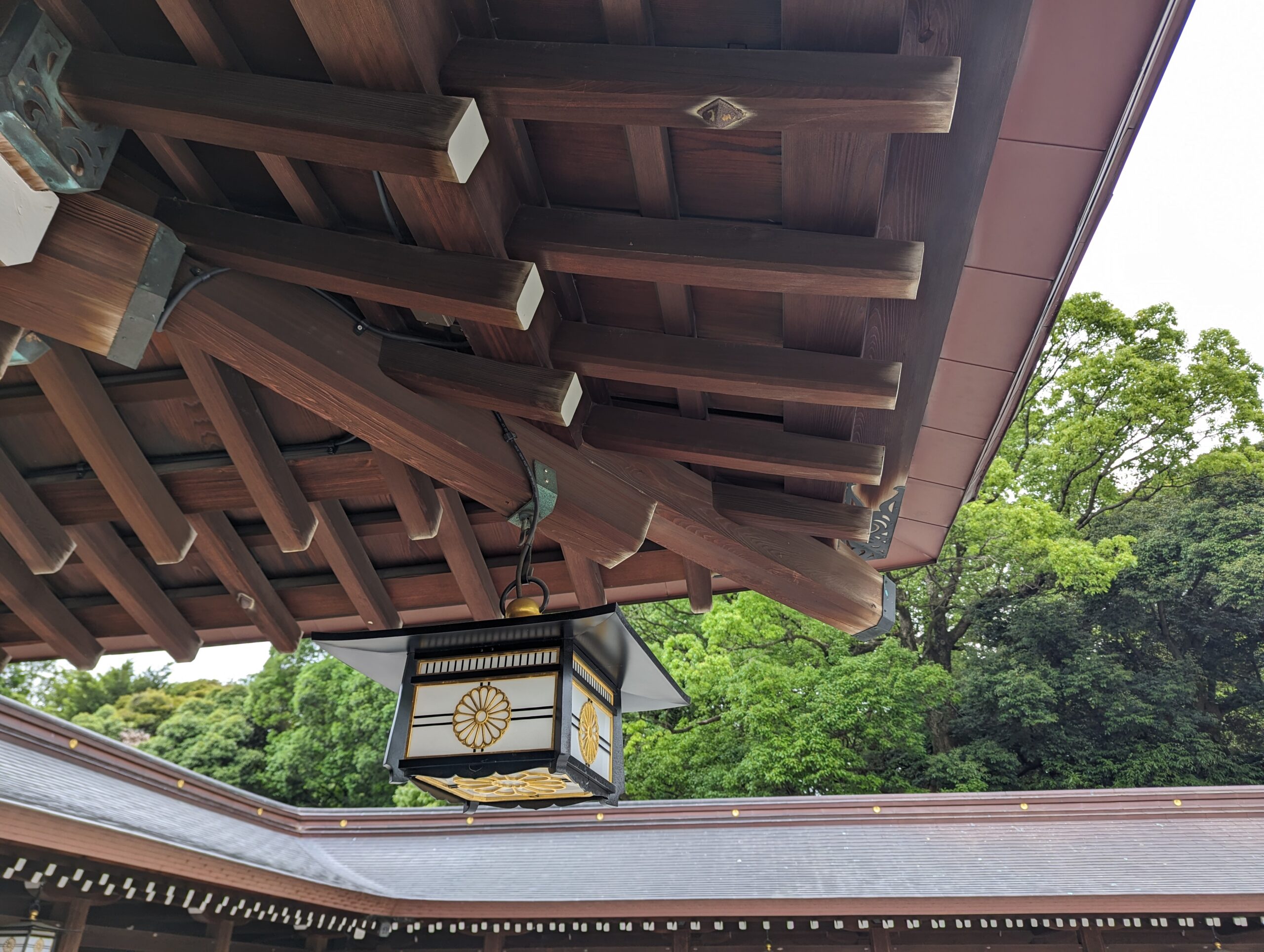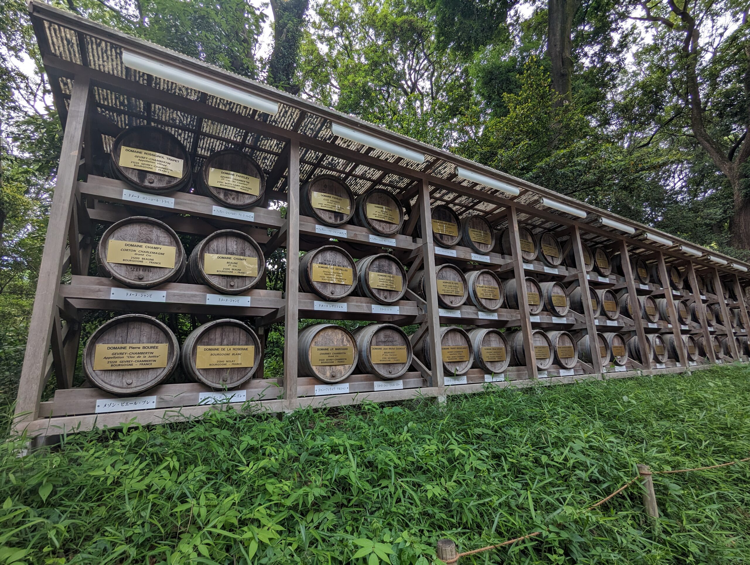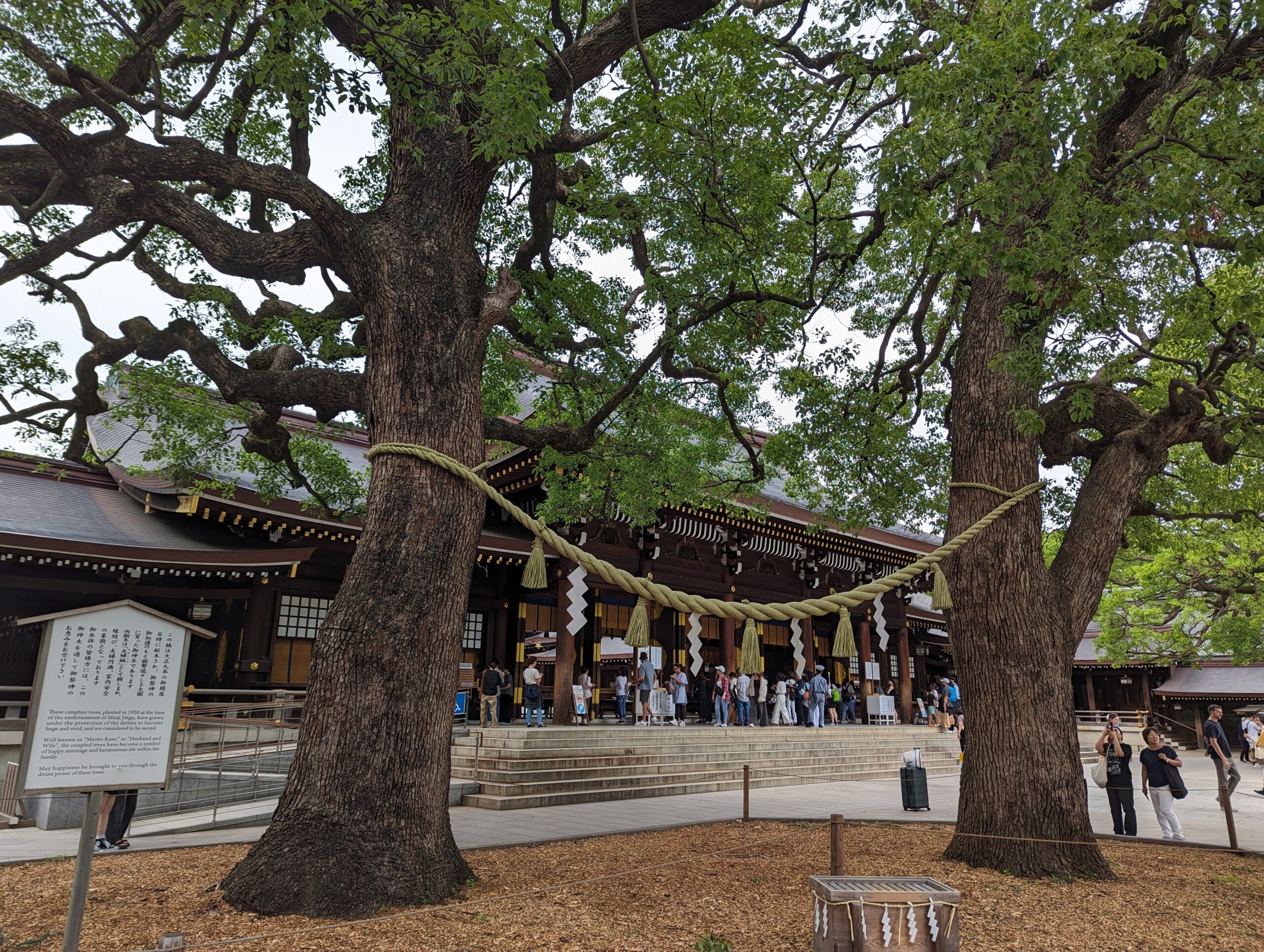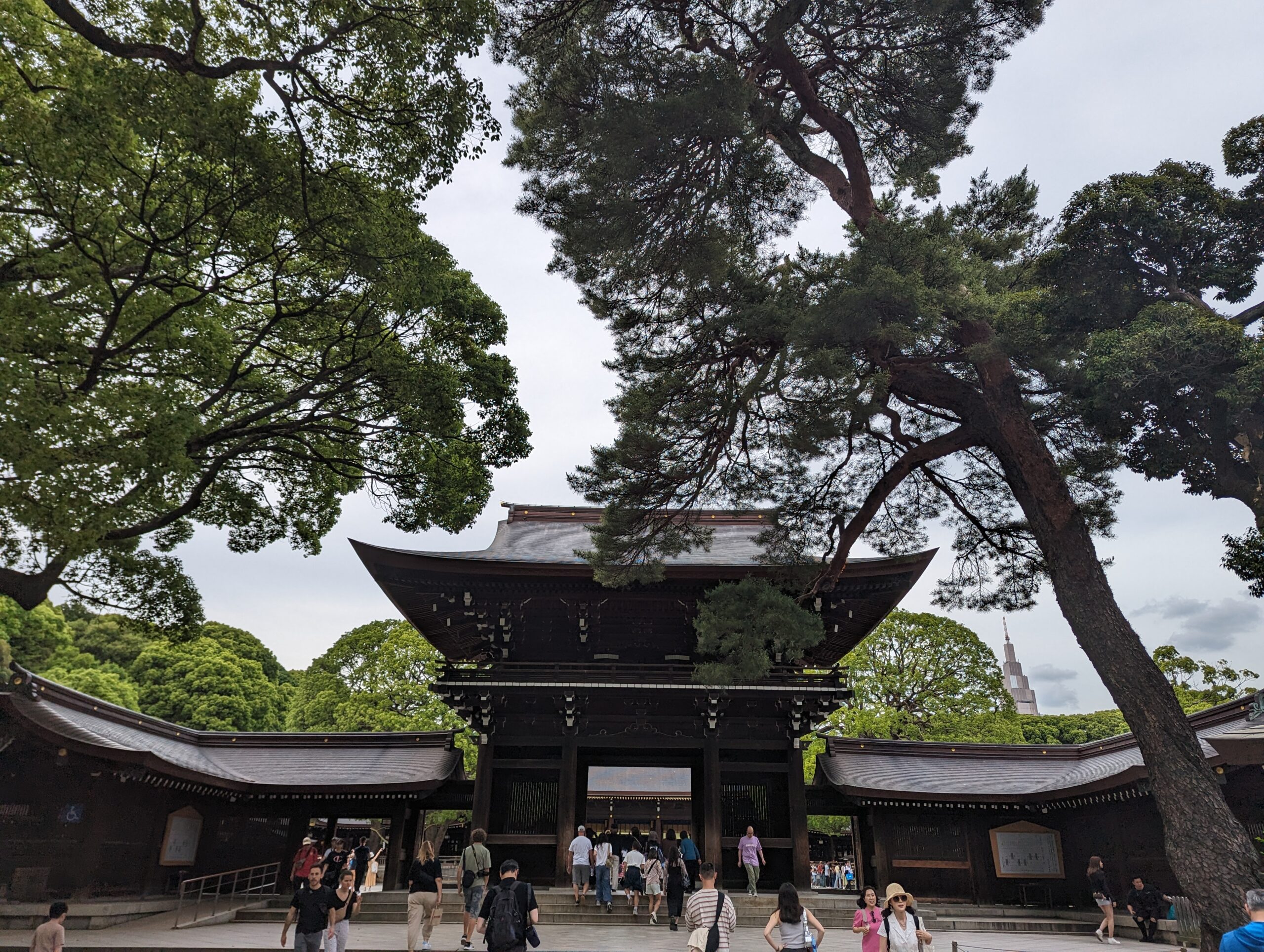 On se dirige après cela vers le temple Meiji jingu, dédié aux âmes divines de l’empereur Meiji, mort en 1912, et de l’impératrice Shōken, morte en 1914. Le sanctuaire a été construit au milieu d’un jardin dessiné par l’empereur et composé de 100 000 arbres donnés de tout le Japon lors de la construction.