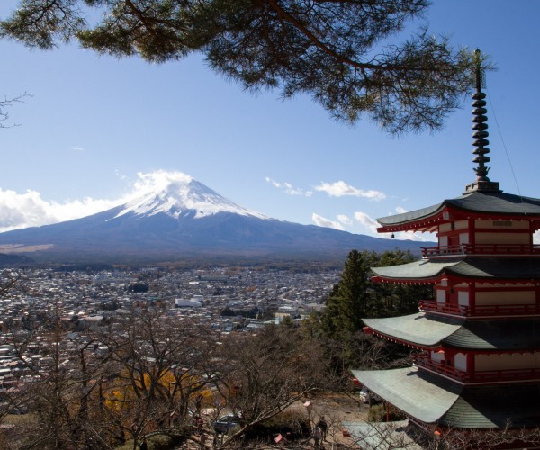 Après plusieurs erreurs d’itinéraire, pas mal de bouchons et donc 3h dans la voiture, nous arrivons au temple Chureito Pagoda, réputé pour sa belle vue sur le Mont Fuji.