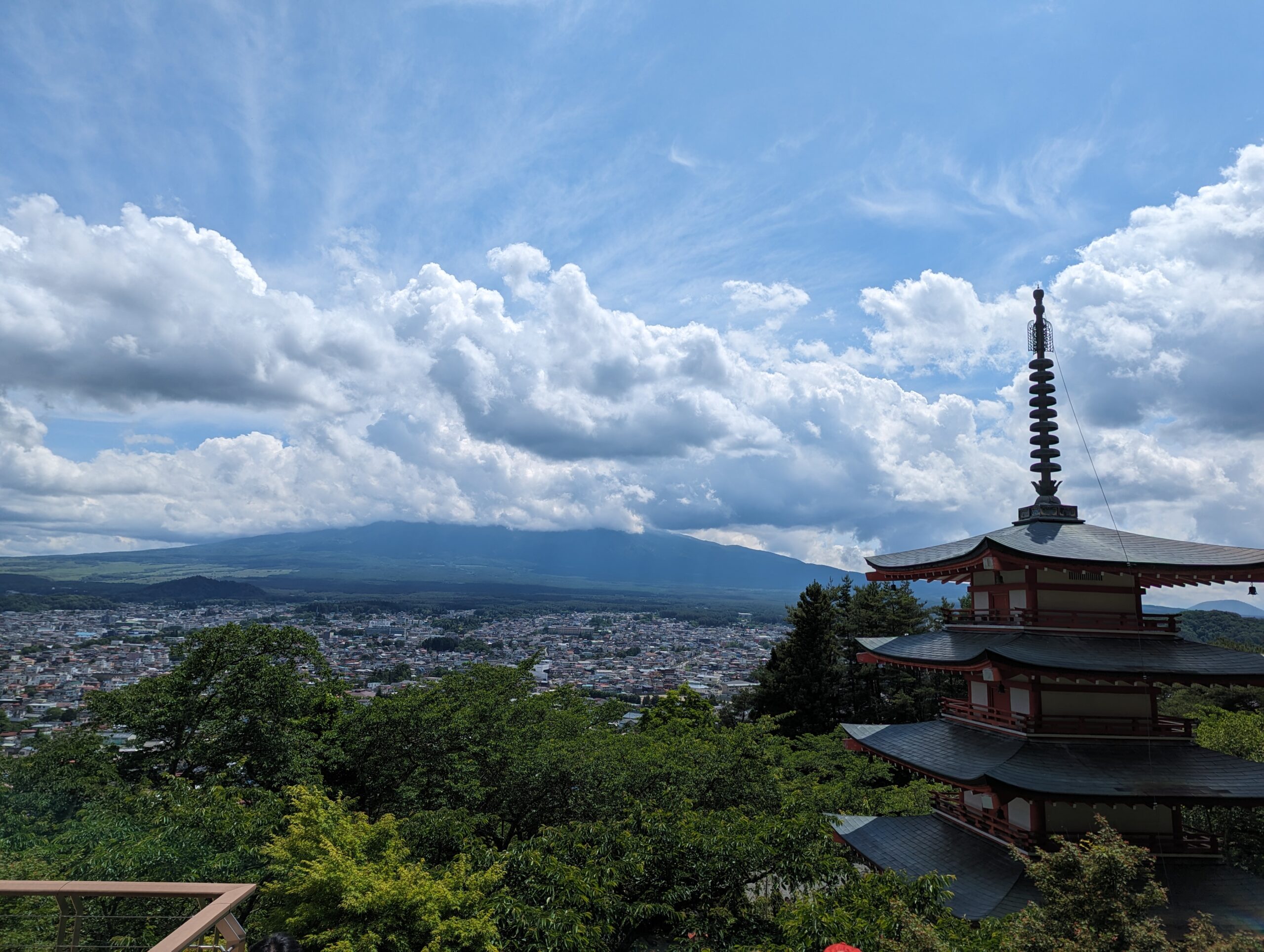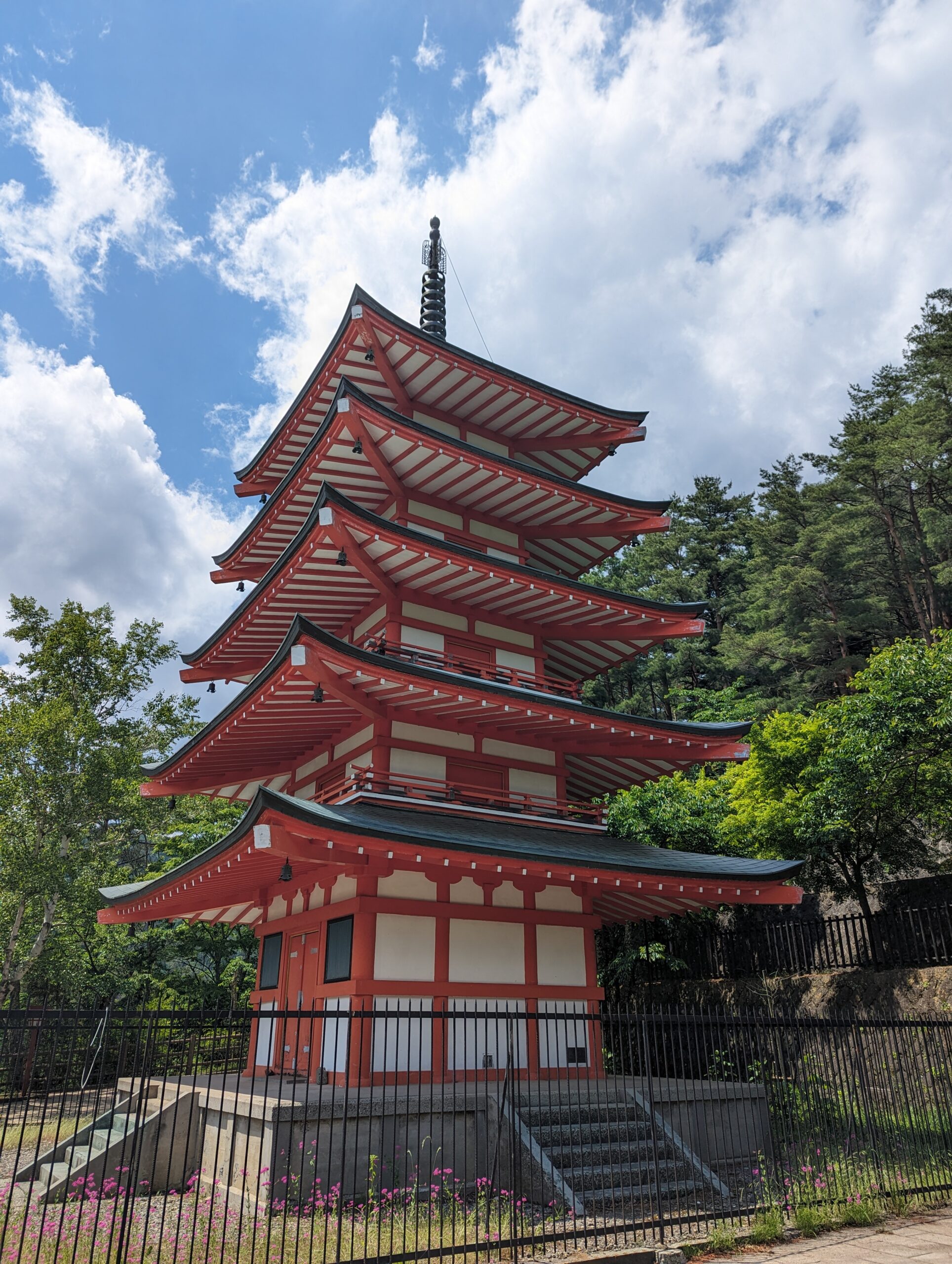 Après plusieurs erreurs d’itinéraire, pas mal de bouchons et donc 3h dans la voiture, nous arrivons au temple Chureito Pagoda, réputé pour sa belle vue sur le Mont Fuji.