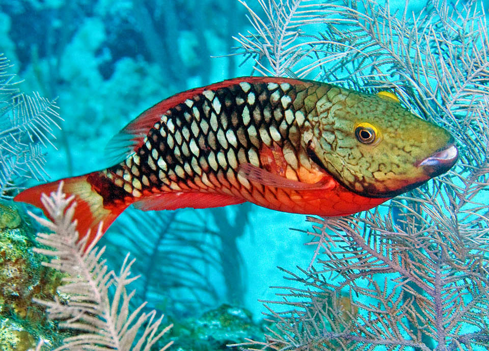 On y observe de nombreux poissons colorés dans leur habitat naturel. Le plus beau étant le poisson perroquet, mâle et femelle.